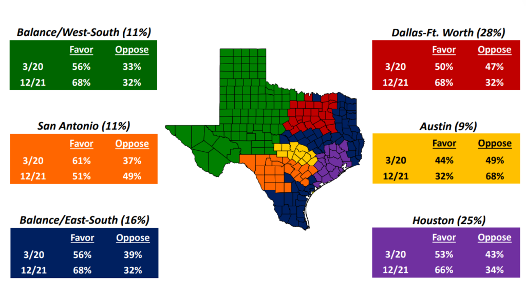Support for fracking in Texas has improved a net 13 points since March 2020. Fracking receives significant backing from Republicans, and has popped a net 25 points to the good among Independents, while Democrats are not as negative as they were in March 2020.